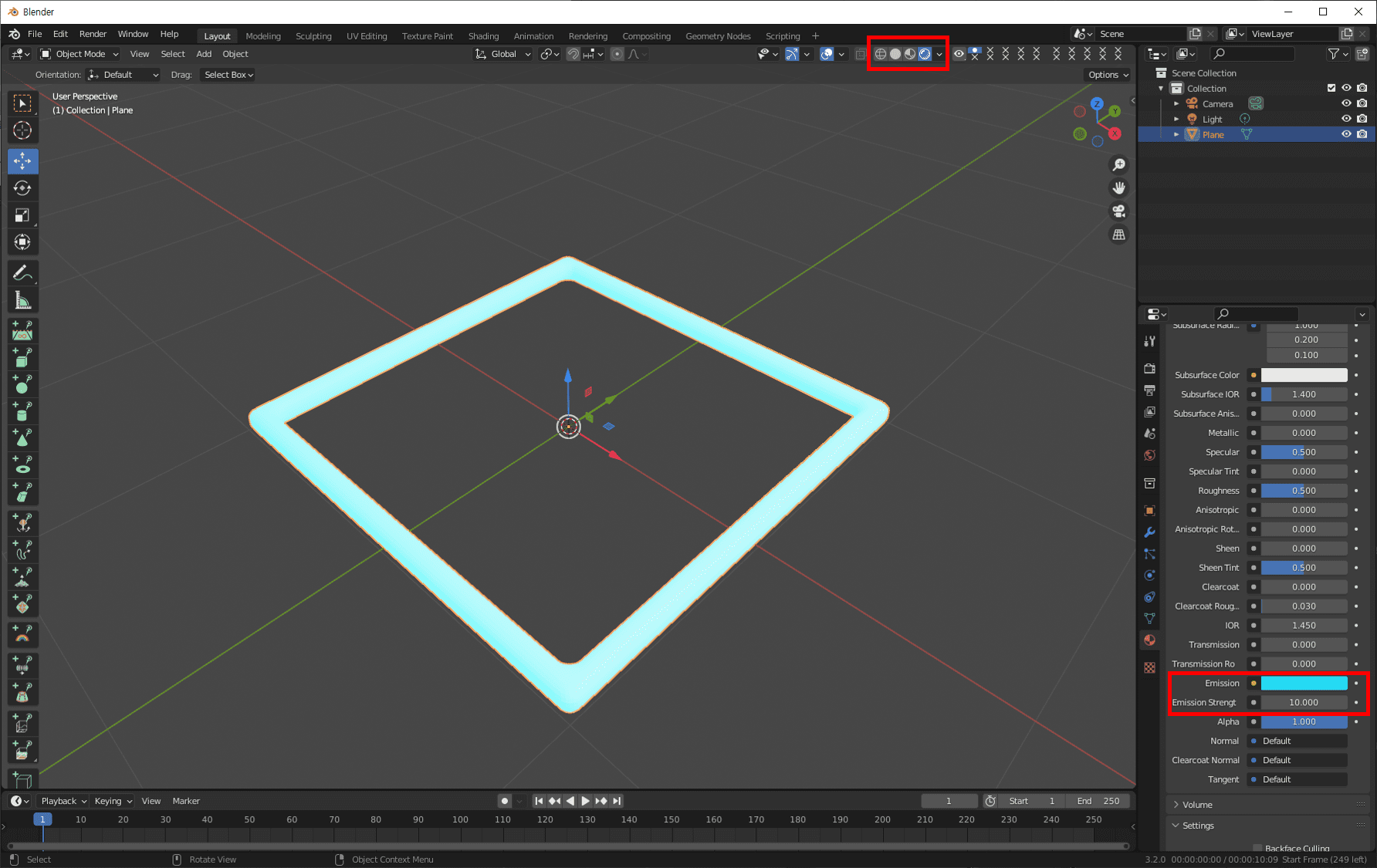 Emission Strengt는 10으로 가장 밝게(세게) 설정했습니다.
