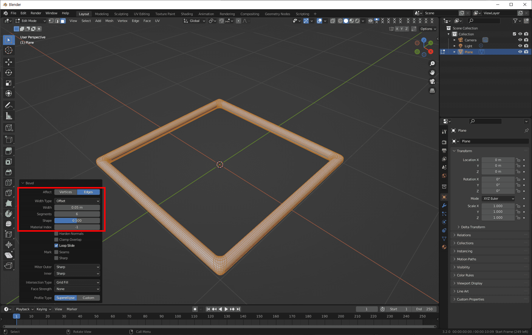 면이 모두 선택된 상태에서 Ctrl + B 를 눌러서 사각 프레임을 부드럽게 Bevel을 시켜줍니다.
