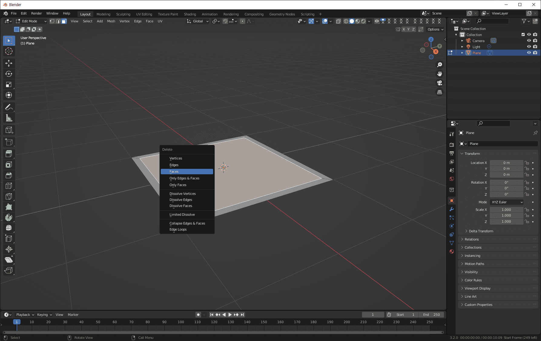 plane을 선택한 상태에서 Tab 키를 눌러서 Edit Mode로 전환하고 Face모드를 선택합니다.