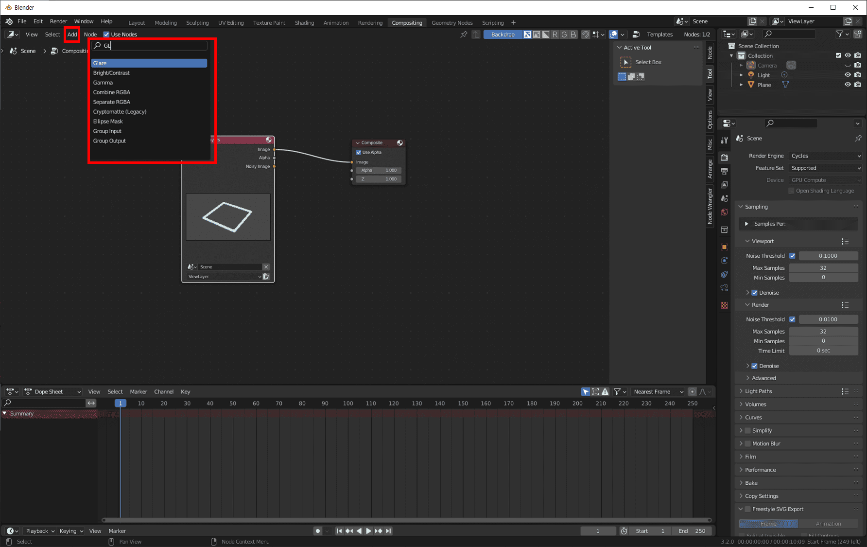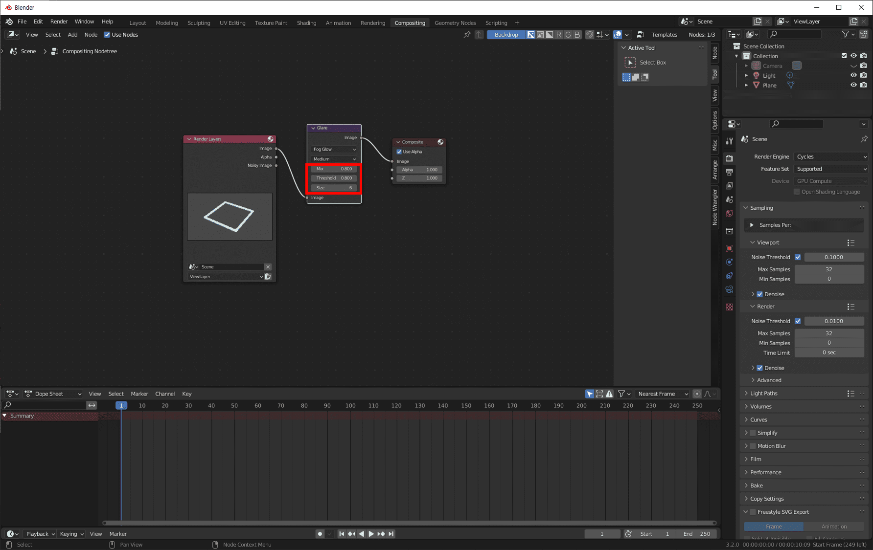Glare 노드를 Render Layer와 Composite 사이로 가져와서 연결시켜 줍니다.
