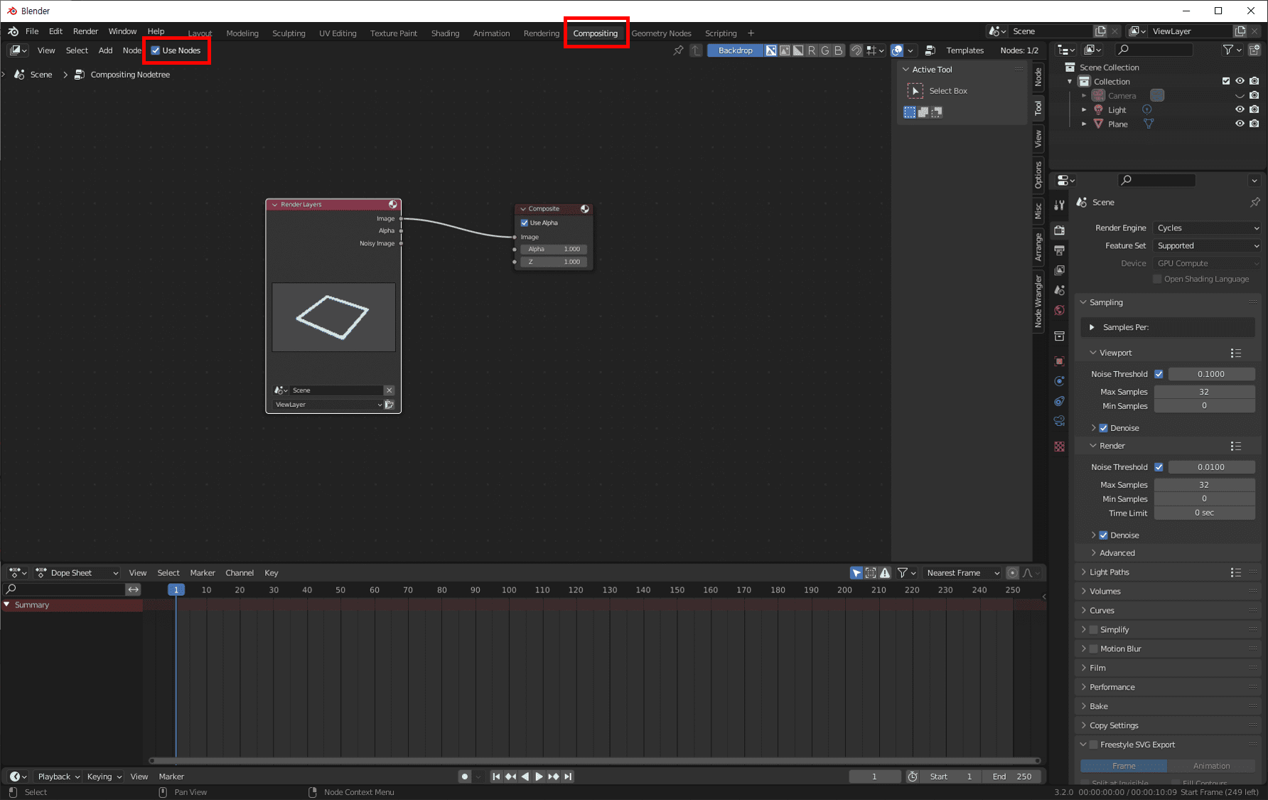 다시 편집화면으로 돌아와서 Compositing 메뉴를 엽니다. Use Nodes에 체크하면 Node가 나타납니다. [2]