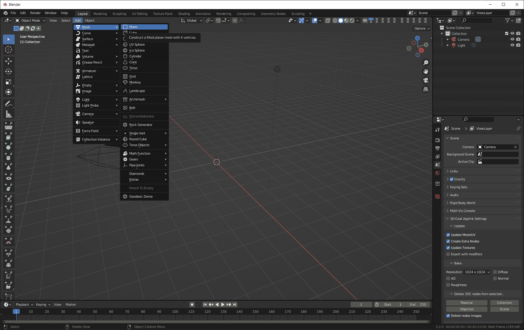 Add > Mesh > Plane을 선택해서 plane을 추가합니다.