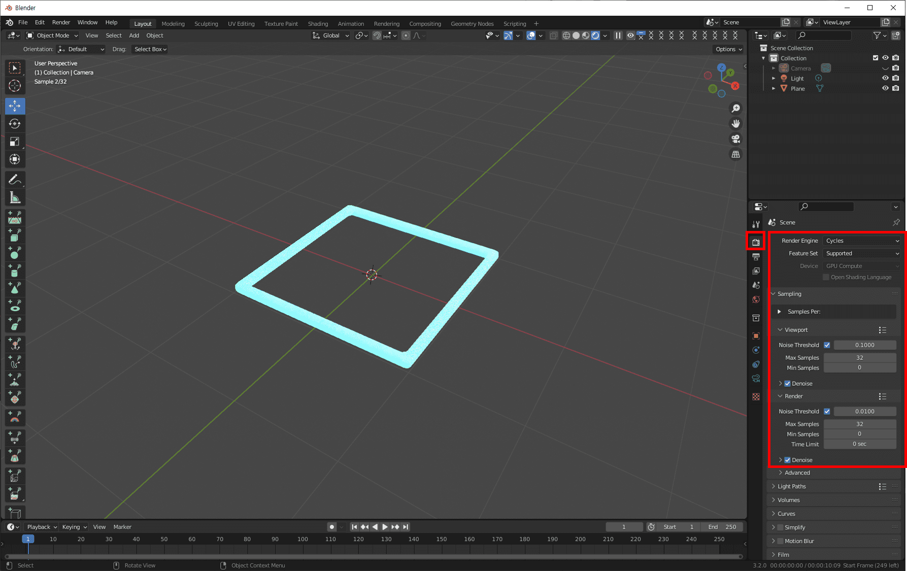 Viewport와 Render에 Max Samples를 32 정도로 설정하고 Denoise에 체크합니다.