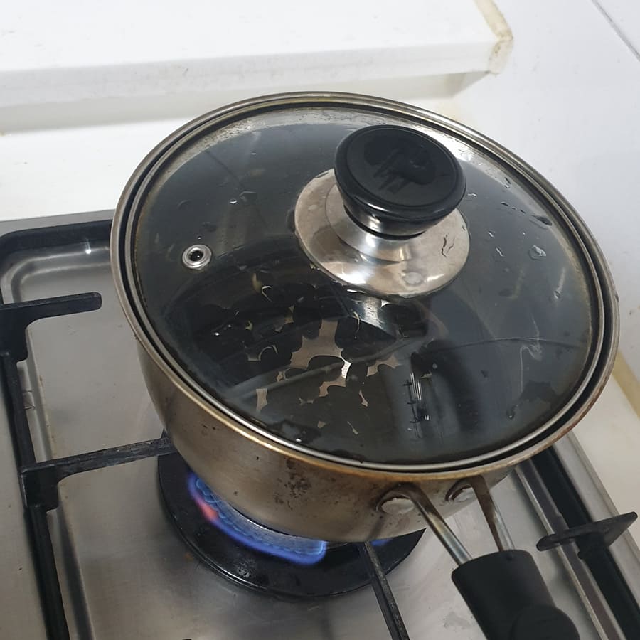 Step2 - 깨끗이 씻은 서리태 콩에 물 2컵(종이컵 크기)을 붓고 강불로 약 3분간 끓여요.
