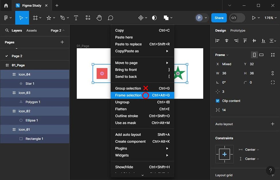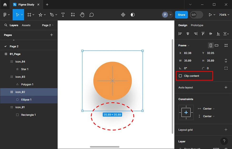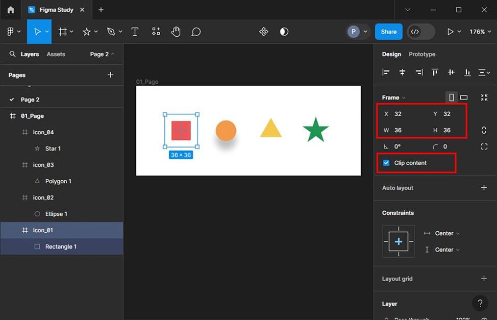그리고 아이콘이 포함된 프레임에 Clip content를 체크해서 이미지가 프레임 바깥으로 나가지 않게 해주면 이런 문제를 해결할 수 있습니다. 그러려면 아이콘은 항상 각각의 프레임에 넣어두어야 해요. 단, 그림자가 프레임사이즈로 잘리면 부자연스럽게 끊어져 보일 수가 있으니까요. 그림자의 크기나 프레임사이즈를 잘 조정해서 그림자가 프레임사이즈를 넘지 않게 해야겠지요.